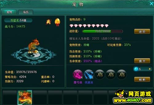 开心路《盛世三国》宠物的成长对玩家来说非常的重要,因为它会影响玩家的伤害的百分比。而且成长越高,对玩家伤害的加成比例也就越高。所以很多玩家除了追求极品的装备的防御和武器攻击力之外,更多的时候,都是在追求宠物的属性,紫色宠物则成为无数玩家努力追逐的对象。