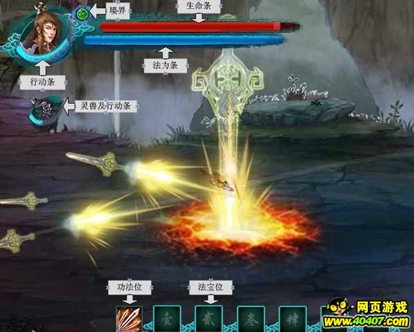 6.法术位:所能使用的最基础攻击,当所有法宝处于冷却状态,无法宝可放时,优先释放法术技能,法术技能可在人物装备界面选择,每次只能携带一个出战。