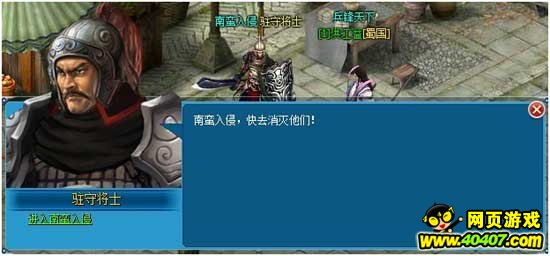 在4399兵锋天下中,玩家等级≥35级时,随时可在王城的“驻守将士”处接受“南蛮入侵”任务,接受任务后通过驻守将士进入南蛮入侵地图。
