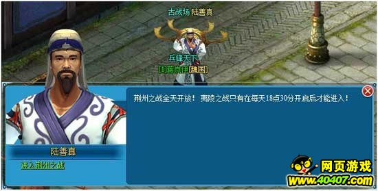 玩家等级≥40级时,可在每天的18:30—24:00之间,通过王城的“古战场”处接受任务,接受任务后通过古战场NPC进入荆州之战地图