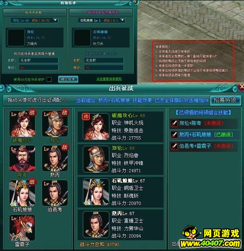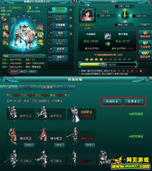 武将成长值决定了武将天赋所拥有的攻击力、生命力、防御值、速度值和武将绝技的威力。游戏中以不同的武将颜色来区分不同品质的将领。每10星改变将领颜色,颜色分为白、绿、蓝、紫、橙、红、黄。玩家在游戏里可以体验到武将转职、武将传承以及搭配不同武将组合作战等功能玩法。