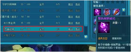 副本奖励:紫色材料碎片,可在轩辕鼎-炼制,炼制成为紫色材料,可以把蓝色装备提升到紫色。