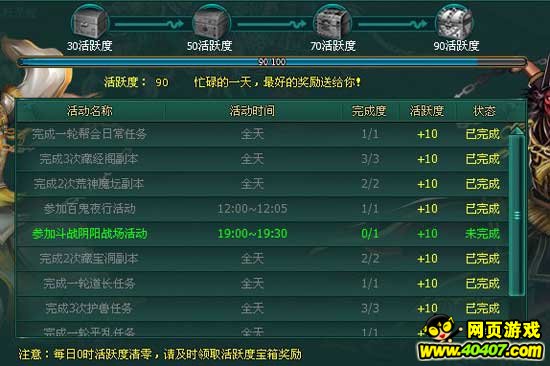 其他的就是去像试炼场这些副本打装备,打到的装备看看,留下最好的,其余的都摆摊卖了,比接任务赚钱多了。另外,主线、支线任务、惩妖台、道长任务之类的日常活动和副本挑战完成也都会给一些钱币奖励。最后,还有个一个不得不提的,在37wan《画皮2》中,完成相应的活动会得到活跃度的奖励,达到对应活跃度还有额外奖励可拿!所以,每天一定要完成活跃度到90哦,这样就能额外获得两万钱币奖励!