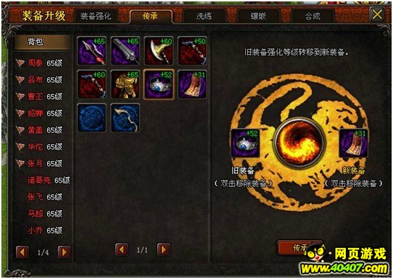 装备传承是由就装备传承往新装备,将原有旧装备的强化等级变为新装备的强化等级,旧装备强化等级清零。