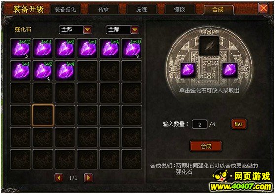 每2块宝石可合成一块更高级别的宝石,宝石最高等级为12级。
