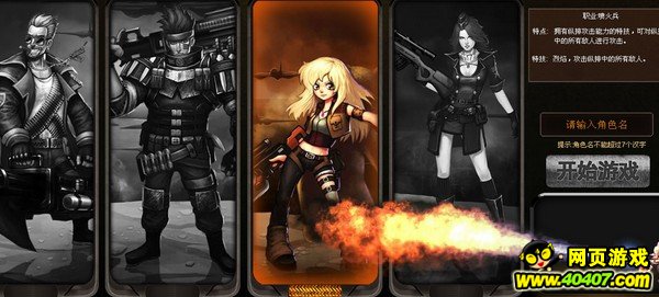 登录成功后,就进入了如下的角色选择界面。在《战争徽记》中有机枪兵、突击兵、喷火兵以及狙击兵4大职业,点击画面上的角色造型,就可以选择自己喜欢的职业,再输出您想取的名称,点击开始游戏,您就可以踏上愉快的游戏之旅了!