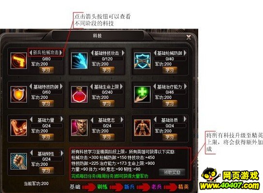 每个科技会分成5个阶段,分别是:基础,训练,新兵,老兵,精英