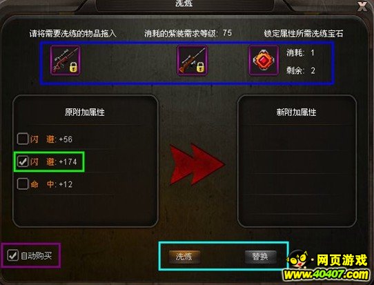 另外,装备洗练时,如果想保留已有的属性,可以使用洗练宝石,选中需要保留的属性,那样洗练过程中需要保留的属性就不会被替换。每保留一条属性,需要消耗10个洗练宝石,当洗练宝石不足时,可以在界面左下角选中自动购买。