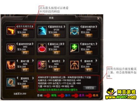 如上图:科技分为枪械攻击、特技攻击、枪械防御、特技防御、生命上限、治疗能力、力量、意志、体质、韧性这10大块。
