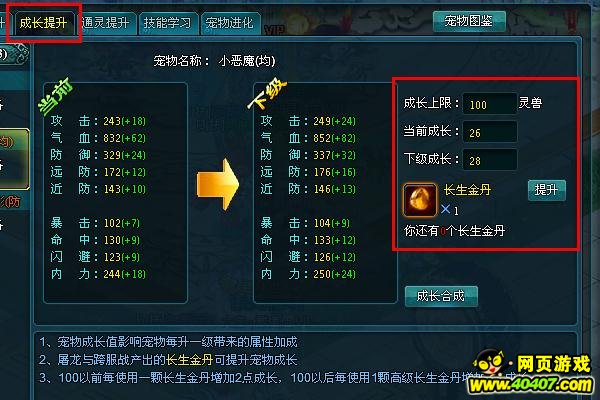 这里先跟大家解释一下什么叫宠物成长,大神级的请无视掉这一段插曲。如下图红线位置说的,就是宠物升级以后获得属性的多少。例如,成长是40的宠物,可能每次升级获得属性点就是40点。成长是100的宠物,升级获得属性点就是100。当然,这个是个举例,并不是说40=40点。~所以别太较真啦~还有个小问题告诉大家一下哦~就算宠物满级了再加成长的话,也是有提升属性点的哦~