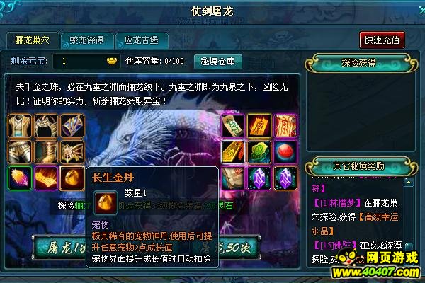 一是屠龙,每天登录游戏签到可以获得屠龙符,不过需要人品的。另外一点就是跨服大战~前十名的礼包奖励中含有长生金丹。