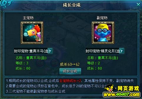 进入合成界面以后呢~很简单的合成规则~就是2个成长相同的宠物就可以合成啦!例如:20成长跟20成长的合成,30成长跟30成长的合成,合成以后作为主宠物的是提升成长,副宠物是会消失的哦。需合成的宠物必须是宠物蛋状态,这里大家要注意了噢~所以主宠的选择就应该不需要小编来教你了吧?想提升哪一个就放主宠物吧。