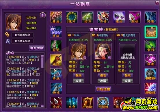 玩家打开斗破苍穹2一站到底界面后,就能见到擂台,点击“开始选擂”即可由系统随机选择24个擂台的其中一个,选中后可点击攻擂,对前三名进行攻擂挑战,如果擂台位置没人,则可直接成为擂主。如果不想通过“开始选擂”进行随机选择擂台,也可通过“强攻”按钮直接挑战你想挑战的擂主。