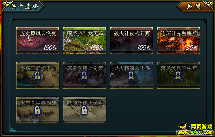 未开放的关卡显示为“锁定”状态,暂时无法挑战。