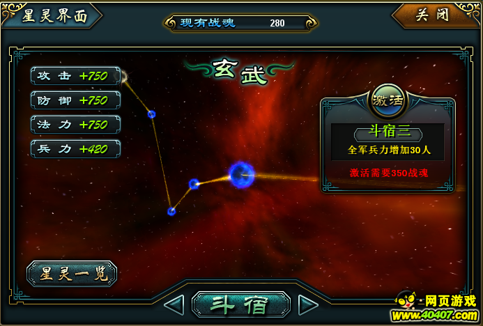 在征战或挑战中获胜后会获得战魂,战魂积累到一定数量就能够点亮天空中一个星宿,从而获得星之灵力,强化你全军的能力。