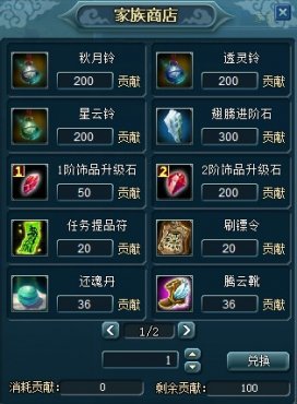 当然,家族贡献值也可以兑换其他物品,像一些红药包、蓝药包,攻击符、防御符,刷镖令、还魂丹之类,我特别推荐大家用贡献值兑换饰品升级石、翅膀进阶石,这类价值比较高的宝物特别受非RMB玩家青睐。嘿嘿,知道家族任务的好处了吧!