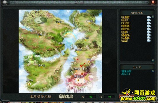 1, 当前地图:显示当前所在地图信息;接口正下方写着所在地图名称,一旁显示鼠标所移动到位置的坐标,接口右侧记录了当前地图内的NPC和出入口的名称,点击后就会自动寻找过去,右下角则可切换查看世界地图。