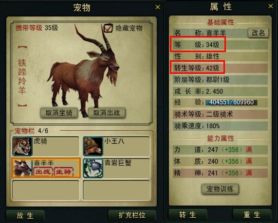 如上图,是一直N转后的羊,当宠物等级达到42就可以继续转生了,这时如果人物等级是46级,宠物达到的转生等级最高就46级;如果人物等级52级,宠物达到的转生等级可能会达到50级,甚至52级。