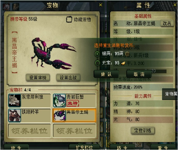宠物重生:如果抓到的宝宝的属性不是自己想要的,可以使用宠物“重生”来重新选择宠物的三项属性,重生后的宠物的三项属性是随机变化的。