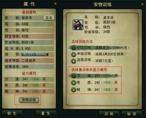 宠物训练:宠物的三项属性是可以通过训练来大幅度提升的,宠物等级越高提升的空间越大。