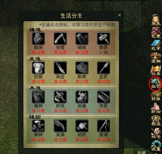 16:强化石合成:合成强化石或者装备需要生活技能达到,这个技能一般在稍微后期点才会达到,生活技能即技艺,是通过银子升级完成,作为江湖侠客们的辅助功能,可以生产制造物品进行交易拍卖,钻前的好渠道,如图: