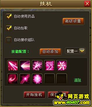 2、技能配置:默认带2套,有配置一和配置二可选,更人性化不同的挂机场景需求。可对应PVP或PVE设置2套不同配置。按自动添加按钮会把所有主动技能按技能等级依次排列。清除则是清掉当前配置的所有技能。