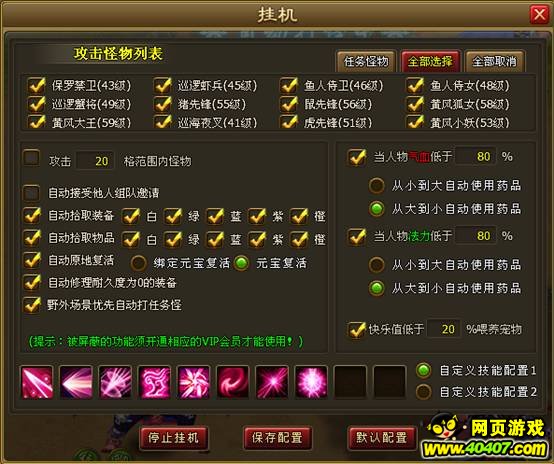 (Tip3:无论打副本、挂机,谨记一个快捷键“Z”,只要你保存好配置,无论到哪里,只要轻轻一按“Z”键,就会自动挂机了!)