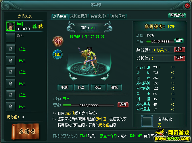 1、家将职业分为:外功型、内功型、体质型、均衡型、英雄豪杰;