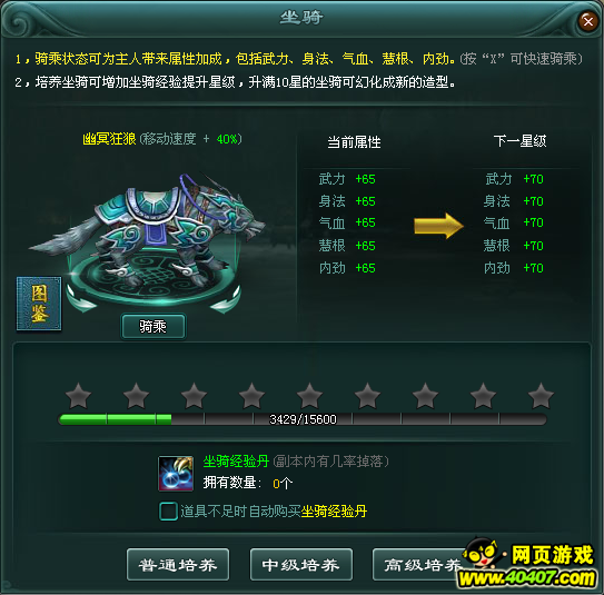 3、坐骑在每提升1个星级都会提升属性值。
