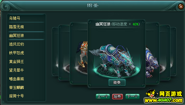 6、坐骑图鉴的存在,不仅仅是记录了已拥有的坐骑展现,同时也多了一份选择性的骑乘,可随意选择已图像中以拥有的坐骑进行骑乘。
