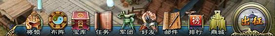 将领、布阵、宝库、任务、军团、好友、邮件、排行、商城、出征