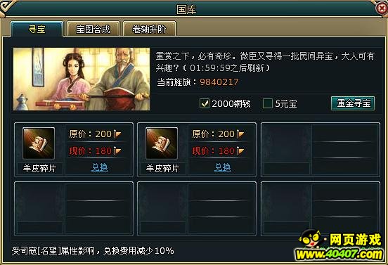 当玩家招募到道家武将后,将会开启建筑“国库”,国库中每隔一段时间就会刷新一些宝物,这些宝物包括,矿石、宝石、藏宝图、军令税令、玉玺等,而且购买这些宝物无须花费元宝和礼金,只需要花费一些旌旗即可获得,因此国库成为一些高玩们淘宝的场所,特别是高级别的藏宝图,更是成为抢手货。