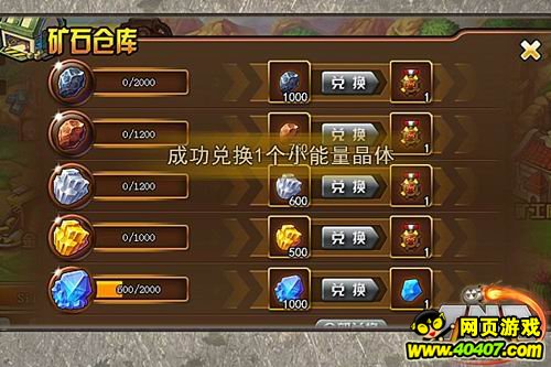 挖出来的各种矿石究竟有什么用处呢?矿石仓库告诉你其中的秘密,铁矿、铜矿、银矿、金矿都可以按照一定的比例兑换成勇气徽章,拥有了大量的勇气徽章,军需宝库就任你行啦!还有珍贵至极的晶体矿石能够兑换成小能量晶体,让你在装备强化的过程中省去不小的开支哦!需要注意的是,矿石仓库储存矿石的数量是有一定上限的,仓库满了就不能收取矿石了,所以玩家需要及时的将矿石兑换成相应的宝贝。