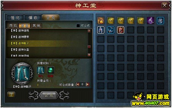 在天机城神工堂中可以进行装备合成,提高装备的品质。合成装备需要各级合成石,合成石可以通过试练塔以及通关副本获得。