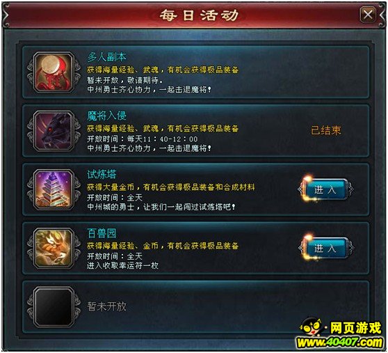 《悍将传世》印象封测版本中,游戏内的每日活动如下:
