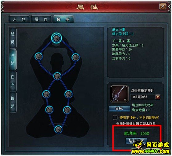 经脉系统在玩家到达20级时开放,玩家可以通过属性面板的经脉页签查看。经脉可以提高玩家各项属性。修炼经脉需要消耗修为值,修为值通过通关副本产出。冲脉有可能失败,失败后当前经脉等级不变,可以使用道具定神针来提高冲脉几率。