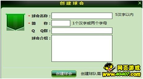 2.您也可以选择自己创建球会,点击“创建球会”按钮,在弹出的“创建球会”面板填写球会名称、简称、QQ群、球会介绍四项信息,就可以拥有自己的球会啦。