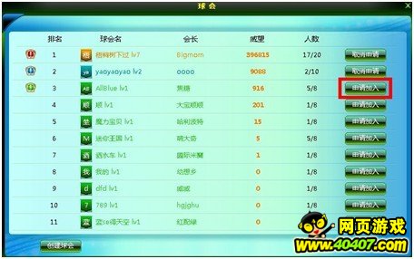 1.如果您还没有球会,可以选择一个球会,点击“申请加入”按钮,等待会长的批准。