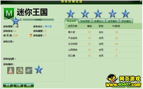标注③:球会成员,显示所有成员的球队名称、等级、植物、PK胜场。
