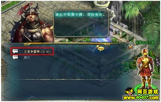8090神戒中有一种玩法,就是王者争霸,在每周二、四、六的晚20:00,只要等级达到33级的玩家就能获得一次进入王者争霸的机会,活动开始后点击右上图示传送到[赫伦堡主城(6250,2050)]与军需官格尔斯对话进入。
