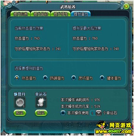 武将4项潜力值可进行选择提升,分别为攻击潜力、防御潜力、灵巧潜力、健体潜力。