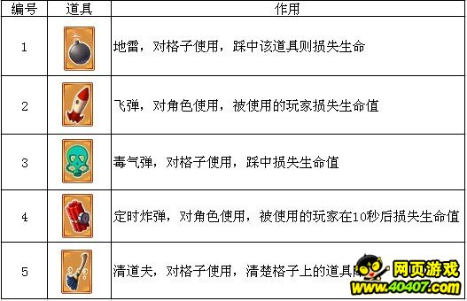 在游戏的过程中各位会随机获得以上的道具,当发现道具栏有新道具可以用的时候,看准时机使用吧,尤其是飞弹跟定时炸弹,看哪个玩家不顺眼的话就尽管用到他身上吧,这两个道具能给予他人很大伤害。当然你也可以使用地雷跟毒气弹,不过这两个道具碰运气的几率比较大,其他玩家可能踩中,你自己也可能踩中。当面前一定步数内的格子上有道具时,别忘了使用清道夫,扫除障碍就属它最强了。