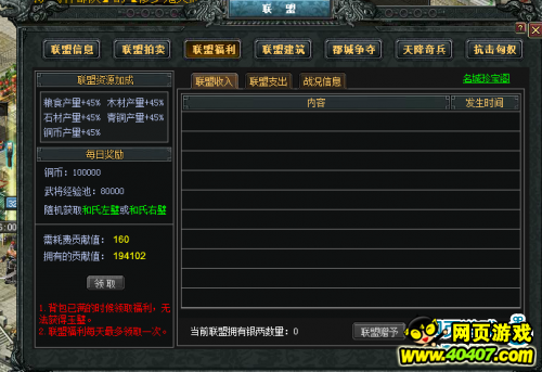 联盟占领郡城之后,国都、郡城、县城每日都会有银两产出,国都每日产量5000银两、三个郡城是每个每日2000,其次的4个县城是每个每日1000两。也就是说,如果一个盟拿下了一国所有城池,将日产1.5W。两盟主会按成员的贡献依次来发放银两。这样想拿到足够多银两的,除了自己为联盟做出贡献之外,最主要的是你能有一个足够实力争夺郡城的联盟。