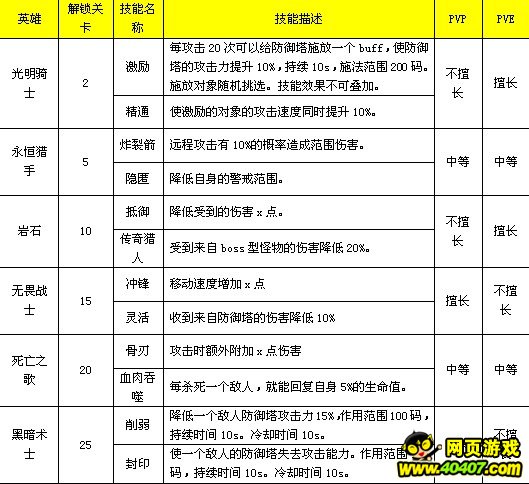 游戏中会出现6个英雄。6个英雄出现的关卡是第2,5,8,15,20,25关。