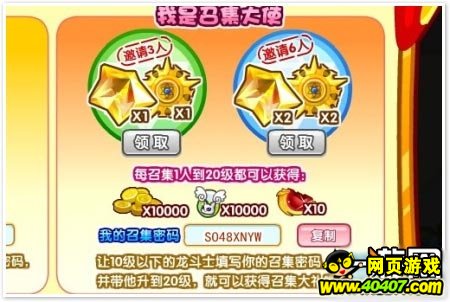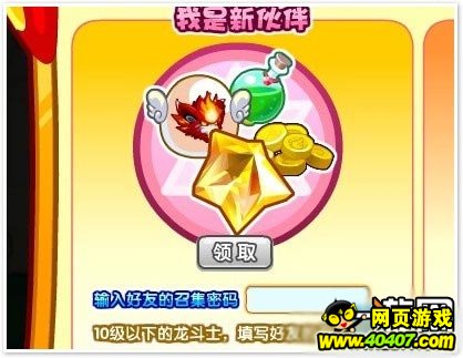 如果你是10以下的龙斗士,只要将自己好友的召集密码,就能得到军团宠物、星能水晶、大量的金币和经验等奖品。