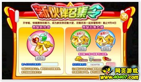 新伙伴召集令活动不但玩法简单,还有军团宠物、星能水晶、强化幸运石、大量的金币和宠物经验等奖品,小编游游强烈建议大家参加。