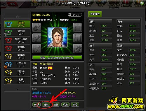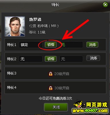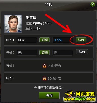 球员特长,可以提升球员的属性。洗练可以刷新特长的数值。