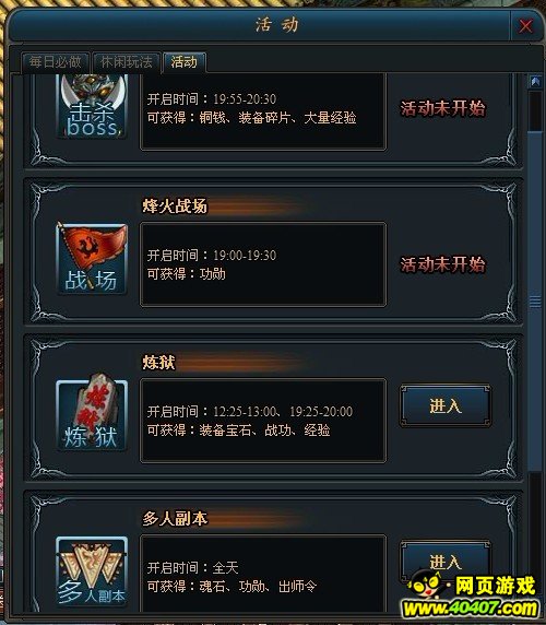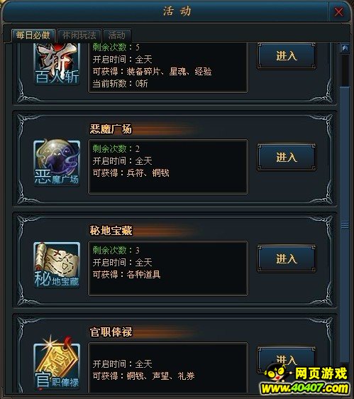 31级开始,游戏的精彩之处才真正开始。主线、支线任务是必做的,每日功勋任务有时间也可以做,200功勋一次。下面通过截图简绍下31级之后陆续出现的活动玩法,请看图