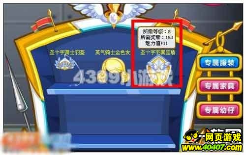 圣十字羽翼宝盾魅力值+11,小奥比的骑士等级达到8级时,可以用150个奖章到【骑士商店】的“专属服装”栏目兑换获得。