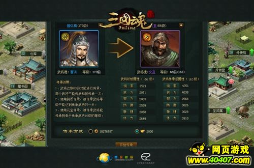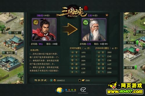 传承武将的等级越高,传承花费的铜币越多,当然,效果也越好,被传承的武将将会获得传承武将的一半等级,如120级的武将使用铜币传承后,被传承的武将等级将可直接提升到60级。